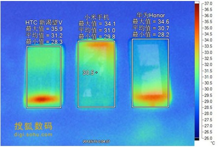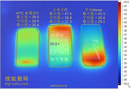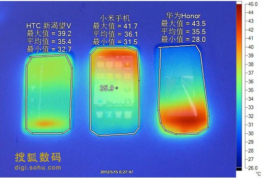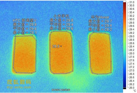 通過(guò)兩個(gè)階段的測(cè)試結(jié)果看,小米手機(jī)在30分鐘視頻播放+12分鐘的游戲之后,機(jī)身最高溫度達(dá)到了45°,確實(shí)有些駭人。
