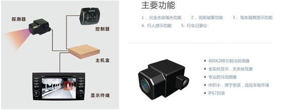 遠紅外熱成像車載安全駕駛輔助系統(tǒng),主要用于車輛在黑夜漆黑環(huán)境、雨雪霧等惡劣天氣環(huán)境中輔助觀察目標,使駕駛員能夠在視距不足或眩暈強光中清晰地觀察到前方路面上的物體。