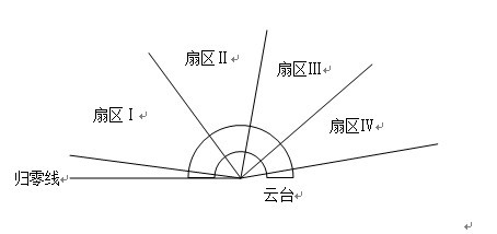 云臺(tái)從扇區(qū)Ⅰ開(kāi)始順時(shí)針轉(zhuǎn)動(dòng),依次轉(zhuǎn)過(guò)扇區(qū)Ⅰ、扇區(qū)Ⅱ、扇區(qū)Ⅲ、扇區(qū)Ⅳ,然后返回到歸零線(xiàn),開(kāi)始下一個(gè)循環(huán)(一個(gè)周期劃分多少個(gè)扇區(qū)根據(jù)現(xiàn)場(chǎng)情況確定)。我們可以在這個(gè)扇區(qū)設(shè)定報(bào)警上限值,一旦檢測(cè)到物料溫度超過(guò)報(bào)警溫度,系統(tǒng)將馬上報(bào)警。