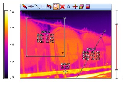 可以對(duì)熱像圖進(jìn)行區(qū)域分析、點(diǎn)分析和線(xiàn)分析,實(shí)時(shí)顯示所選區(qū)域最高、最低和平均溫度,如圖所示: