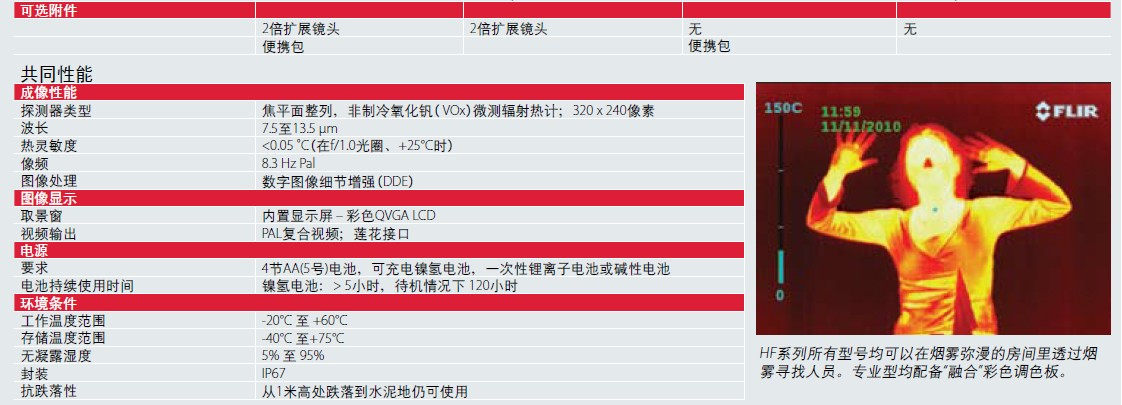 HF系列產品并非專為滿足NFPA 1801的要求或類似國家標準(專門規定用于存在火災危險的極端現場環境中的消防熱成像儀)而設計。HF系列產品僅符合上表中所述規格,僅在煙霧彌漫的環境和非極端環境下用作輔助工具,在火災危險區域以外為消防人員提供協助和/或對明火已熄滅卻由于煙霧、蒸汽、光線不佳或其它光線限制條件而很難巡查的區域進行檢查。