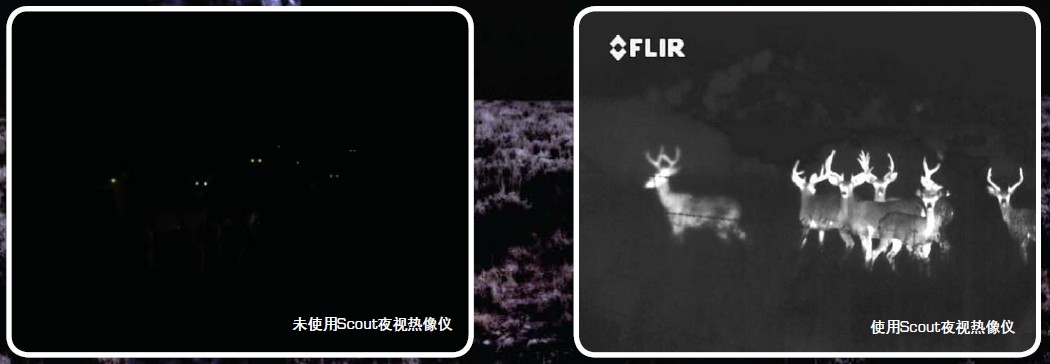 ? 同其它夜視技術相比,您看得更廣更遠 – Scout夜視熱像儀無需任何光源即可看清物體,、同那些需要環境光源才能工作的成像技術相比,Scout熱像儀在夜間看得更遠;并且Scout夜視熱像儀可以發現其它攝像儀不能發現的熱源。